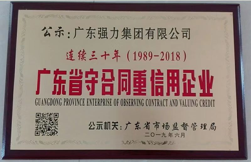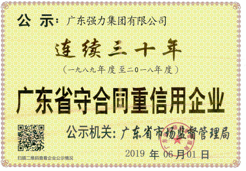 近日,廣東強力集團有限公司獲得由廣東省市場監(jiān)督管理局評定“廣東省守合同重信用企業(yè)”榮譽稱號。憑借良好的企業(yè)信用,已連續(xù)三十年(1989-2018)獲得此項殊榮。近幾年,市場競爭是越演越烈,我司不斷完善經(jīng)營管理、規(guī)范管理運作管理,在業(yè)務往來中,以誠取信,樹立了良好的企業(yè)形象和信譽,公司合同履行率為100%,受到客戶的一致好評。
