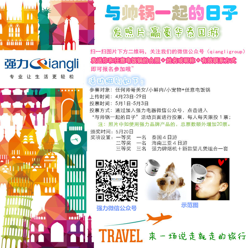 由我司組織的活動:與帥“鍋”一起的日子現(xiàn)已進入投票階段,投票將于5月1日0時開始,請各位朋友趕快關(guān)注強力電器微信:qiangligroup,參與:與帥“鍋”一起的日子,已關(guān)注公眾號朋友們請回復(fù)“投票”參與活動,為你喜歡的他/她/它投上寶貴